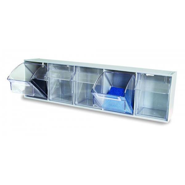 Contenedor de 5 cajones basculantes de plรกstico transparente de la marca Tayg. El sistema consta de un armazรณn dividido en compartimentos, en cada uno de los cuales se aloja un cajรณn basculante de plรกstico transparente.